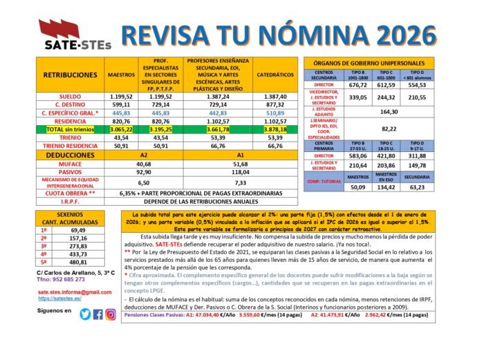JUBILACIONES 2026. TABLA DE PENSIONES DE CLASES PASIVAS 2026 (SALARIOS BRUTOS) Feb 3, 2026 Noticias