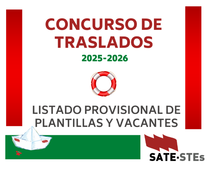Destacados Novedades III CONVOCATORIA EXTRAORDINARIA CURSO 2025-2026. MELILLA Feb 9, 2026 Convocatoria extraordinaria, Interinos, Noticias REVISA TU NÓMINA 2026 ACTUALIZADO Feb 9, 2026 Noticias LAS RATIOS ACTUALES NO PERMITEN UNA ENSEÑANZA INDIVIDUALIZADA Feb 9, 2026 Acción Sindical, Comunicados, Noticias SATE-STEs RECLAMAMOS UNA REFORMA PROFUNDA DEL SISTEMA DE ACCESO A LA PROFESIÓN DOCENTE Feb 3, 2026 Acción Sindical, Comunicados, Noticias, Oposiciones JUBILACIONES 2026. TABLA DE PENSIONES DE CLASES PASIVAS 2026 (SALARIOS BRUTOS) Feb 3, 2026 Noticias ACTIVISTAS EN EL MEDIO AMBIENTE: TEMA DEL MES DE FEBRERO EN EL CALENDARIO COEDUCATIVO «MUJERES ACTIVISTAS» Feb 2, 2026 Área de Mujer, Comunicados, Noticias Todas las noticias Convocatorias extraordinarias Área de la mujer Boletines "El Clarión" y "Salud laboral" Archivos Elegir el mes febrero 2026 enero 2026 diciembre 2025 noviembre 2025 octubre 2025 septiembre 2025 agosto 2025 julio 2025 junio 2025 mayo 2025 abril 2025 marzo 2025 febrero 2025 enero 2025 diciembre 2024 noviembre 2024 octubre 2024 septiembre 2024 agosto 2024 julio 2024 junio 2024 mayo 2024 abril 2024 marzo 2024 febrero 2024 enero 2024 diciembre 2023 noviembre 2023 octubre 2023 septiembre 2023 agosto 2023 julio 2023 junio 2023 mayo 2023 abril 2023 marzo 2023 febrero 2023 enero 2023 diciembre 2022 noviembre 2022 octubre 2022 septiembre 2022 agosto 2022 julio 2022 junio 2022 mayo 2022 abril 2022 marzo 2022 febrero 2022 enero 2022 diciembre 2021 noviembre 2021 octubre 2021 septiembre 2021 agosto 2021 julio 2021 junio 2021 mayo 2021 abril 2021 marzo 2021 febrero 2021 enero 2021 diciembre 2020 noviembre 2020 octubre 2020 septiembre 2020 agosto 2020 julio 2020 junio 2020 mayo 2020 abril 2020 marzo 2020 febrero 2020 enero 2020 diciembre 2019 noviembre 2019 octubre 2019 septiembre 2019 agosto 2019 julio 2019 junio 2019 mayo 2019 abril 2019 marzo 2019 febrero 2019 enero 2019 diciembre 2018 noviembre 2018 octubre 2018 septiembre 2018 agosto 2018 julio 2018 junio 2018 mayo 2018 abril 2018 marzo 2018 febrero 2018 enero 2018 diciembre 2017 noviembre 2017 octubre 2017 septiembre 2017 agosto 2017 julio 2017 junio 2017 mayo 2017 abril 2017 marzo 2017 febrero 2017 enero 2017 diciembre 2016 noviembre 2016 octubre 2016 septiembre 2016 agosto 2016 julio 2016 Buscar Seleccionar Categoría Acción Sindical Acción social Adjudicación vacantes Área de Mujer Comunicados Concurso de Traslados Convocatoria extraordinaria Efemérides Exterior Formación Formación Profesional Funcionarios de carrera Interinos Mesa de Trabajo Ceuta y Melilla Noticias Oposiciones Reuniones con la DP Salud Laboral Uncategorized CONTRA ESTA REFORMA DE LA PROFESIÓN DOCENTE Guía del funcionario/a en prácticas Charla Estatal sobre la FP Dual Concurso de méritos extraordinario. Proceso de estabilización. Oposiciones y sistemas de acceso (Higinio Rodríguez) Manual Solicitud/Renovación Certificado Empleado Público Manual SATE-STEs de registro electrónico de documentos Manual SATE-STEs consulta tus nóminas UNIDADES DIDÁCTICAS