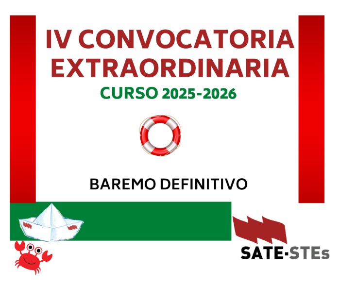 Destacados Novedades FUNCIONARIOS DE CARRERA EN EXPECTATIVA DE DESTINOS. PETICIÓN DE CENTROS Abr 20, 2026 Funcionarios de carrera, Noticias IV CONVOCATORIA EXTRAORDINARIA MELILLA. CURSO 2025-2026. LISTADO DEFINITIVO DE ADMITIDOS Y EXCLUIDOS. BAREMO PROVISIONAL Abr 17, 2026 Convocatoria extraordinaria, Interinos, Noticias REUNIÓN MESA DE TRABAJO CEUTA Y MELILLA. 16-04-2026 Abr 16, 2026 Convocatoria extraordinaria, Interinos, Noticias INFORMACIÓN FECHAS IMPORTANTES: LISTAS DE INTERINOS CURSO 2026-27 Abr 16, 2026 Interinos, Noticias INFORME DE LA REUNIÓN ENTRE LOS SINDICATOS Y LA DIRECCIÓN PROVINCIAL. 15/04/2026 Abr 15, 2026 Noticias, Reuniones con la DP INTERINOS E INTERINAS DOCENTES: UNA PRIORIDAD MÁS PARA SATE-STEs Abr 14, 2026 Acción Sindical, Comunicados, Interinos, Noticias Todas las noticias Convocatorias extraordinarias Área de la mujer Boletines "El Clarión" y "Salud laboral" Archivos Elegir el mes abril 2026 marzo 2026 febrero 2026 enero 2026 diciembre 2025 noviembre 2025 octubre 2025 septiembre 2025 agosto 2025 julio 2025 junio 2025 mayo 2025 abril 2025 marzo 2025 febrero 2025 enero 2025 diciembre 2024 noviembre 2024 octubre 2024 septiembre 2024 agosto 2024 julio 2024 junio 2024 mayo 2024 abril 2024 marzo 2024 febrero 2024 enero 2024 diciembre 2023 noviembre 2023 octubre 2023 septiembre 2023 agosto 2023 julio 2023 junio 2023 mayo 2023 abril 2023 marzo 2023 febrero 2023 enero 2023 diciembre 2022 noviembre 2022 octubre 2022 septiembre 2022 agosto 2022 julio 2022 junio 2022 mayo 2022 abril 2022 marzo 2022 febrero 2022 enero 2022 diciembre 2021 noviembre 2021 octubre 2021 septiembre 2021 agosto 2021 julio 2021 junio 2021 mayo 2021 abril 2021 marzo 2021 febrero 2021 enero 2021 diciembre 2020 noviembre 2020 octubre 2020 septiembre 2020 agosto 2020 julio 2020 junio 2020 mayo 2020 abril 2020 marzo 2020 febrero 2020 enero 2020 diciembre 2019 noviembre 2019 octubre 2019 septiembre 2019 agosto 2019 julio 2019 junio 2019 mayo 2019 abril 2019 marzo 2019 febrero 2019 enero 2019 diciembre 2018 noviembre 2018 octubre 2018 septiembre 2018 agosto 2018 julio 2018 junio 2018 mayo 2018 abril 2018 marzo 2018 febrero 2018 enero 2018 diciembre 2017 noviembre 2017 octubre 2017 septiembre 2017 agosto 2017 julio 2017 junio 2017 mayo 2017 abril 2017 marzo 2017 febrero 2017 enero 2017 diciembre 2016 noviembre 2016 octubre 2016 septiembre 2016 agosto 2016 julio 2016 Buscar Seleccionar Categoría Acción Sindical Acción social Adjudicación vacantes Área de Mujer Comunicados Concurso de Traslados Convocatoria extraordinaria Efemérides Exterior Formación Formación Profesional Funcionarios de carrera Interinos Mesa de Trabajo Ceuta y Melilla Noticias Oposiciones Reuniones con la DP Salud Laboral Uncategorized CONTRA ESTA REFORMA DE LA PROFESIÓN DOCENTE Guía del funcionario/a en prácticas Charla Estatal sobre la FP Dual Concurso de méritos extraordinario. Proceso de estabilización. Oposiciones y sistemas de acceso (Higinio Rodríguez) Manual Solicitud/Renovación Certificado Empleado Público Manual SATE-STEs de registro electrónico de documentos Manual SATE-STEs consulta tus nóminas UNIDADES DIDÁCTICAS