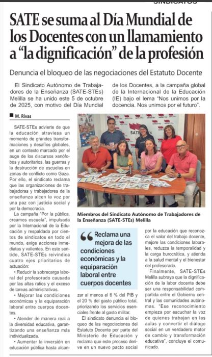 DÍA 5 DE OCTUBRE DE 2025. DÍA MUNDIAL DE LAS Y LOS DOCENTES por SATE STEs | Oct 5, 2025 | Acción Sindical, Comunicados, Noticias COMUNICADO OFICIAL DÍPTICO OFICIAL COMUNICADO EN: MELILLA HOY