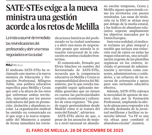 SATE-STEs EXIGE A LA NUEVA MINISTRA DE EDUCACIÓN Y FORMACIÓN PROFESIONAL UNA GESTIÓN DECIDIDA Y ESPECÍFICA PARA CEUTA Y MELILLA por SATE STEs | Dic 26, 2025 | Acción Sindical, Comunicados, Noticias | 0 Comentarios COMUNICADO OFICIAL COMUNICADO EN: EL FARO DE MELILLA COMUNICADO EN: MELILLA HOY COMUNICADO EN: ONDA CERO MELILLA COMUNICADO EN: MELILLA HOY COMUNICADO EN: POPULAR TV MELILLA COMUNICADO EN: COPE MELILLA Enviar comentario Cancelar la respuestaTu dirección de correo electrónico no será publicada. Los campos obligatorios están marcados con *Comentario * Nombre * Correo electrónico * Web Guarda mi nombre, correo electrónico y web en este navegador para la próxima vez que comente.