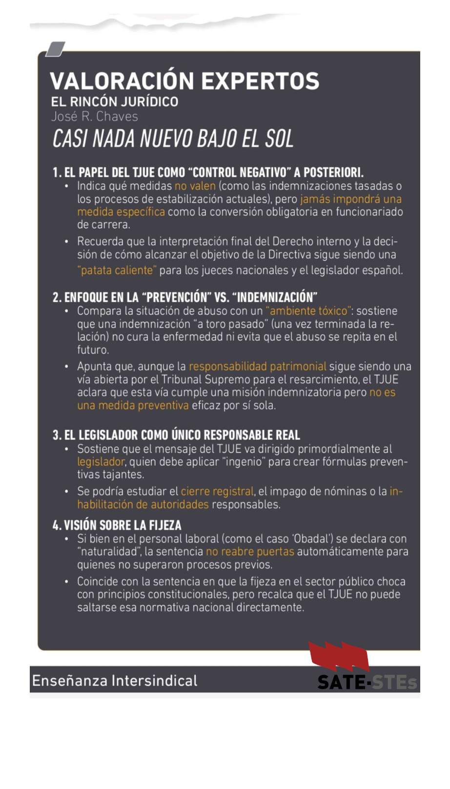 La reciente publicación de la sentencia del Tribunal de Justicia de la Unión Europea (TJUE) en el asunto C-418/24 (Caso Obadal) confirma de manera irrebatible que la respuesta al abuso de la temporalidad en el sector público es incompatible con el Derecho de la Unión Europea. Ante este nuevo escenario normativo, SATE -STEs exige que la Administración deje de gestionar la precariedad mediante el sistema «baile de plazas» y asuma, de una vez por todas, su responsabilidad en la estabilización de las personas que han sostenido la Educación Pública, garantizando soluciones que aporten estabilidad real y no meros arreglos puntuales.