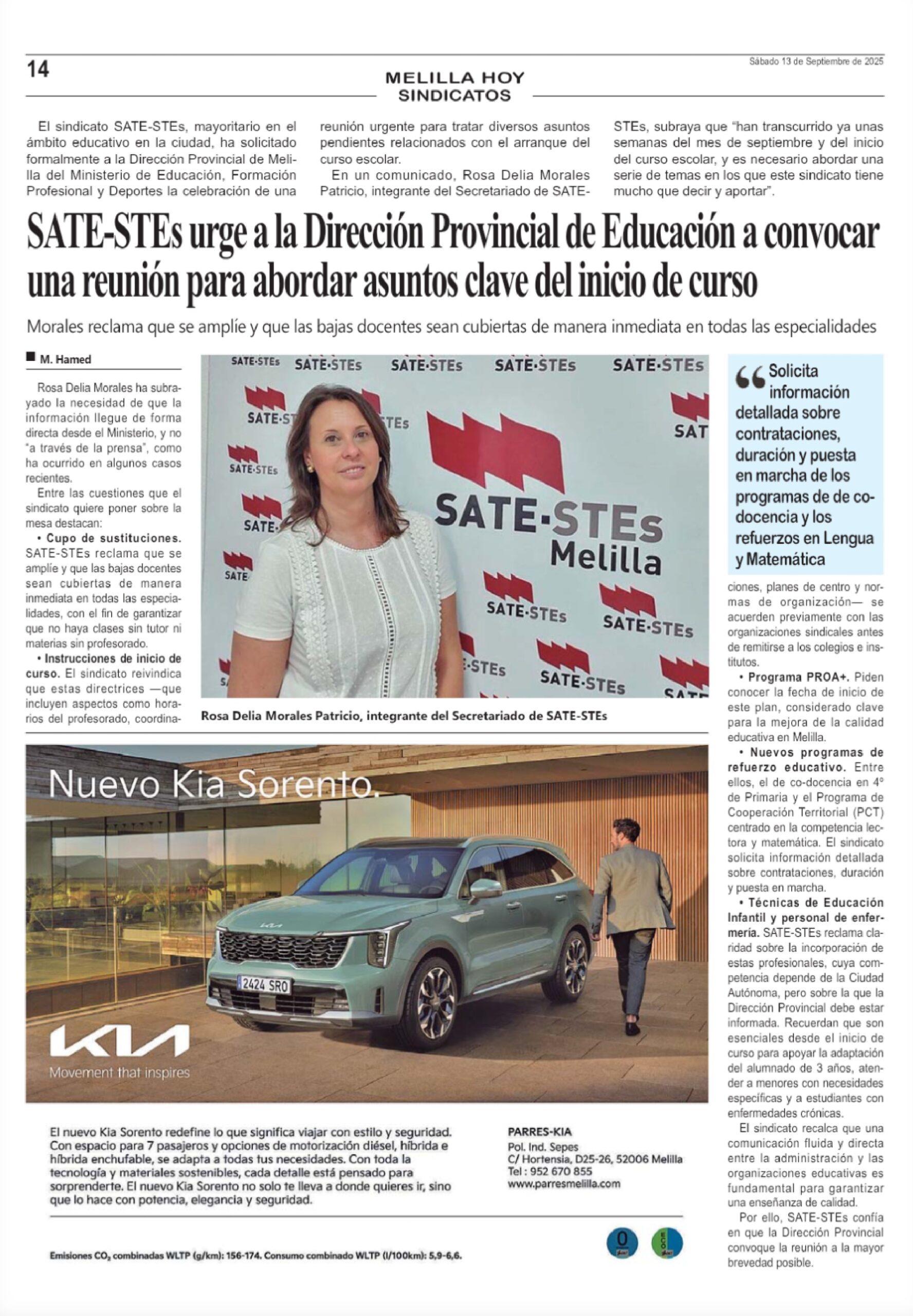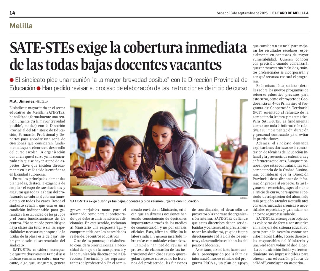 SATE-STEs INSTA A LA DIRECCIÓN PROVINCIAL DE MELILLA DEL MINISTERIO DE EDUCACIÓN, FORMACIÓN PROFESIONAL Y DEPORTES A CELEBRAR UNA REUNIÓN por SATE STEs | Sep 13, 2025 | Acción Sindical, Comunicados, Noticias COMUNICADO OFICIAL COMUNICADO EN: MELILLA HOY COMUNICADO EN: EL FARO DE MELILLA COMUNICADO EN: ONDA CERO MELILLA COMUNICADO EN: COPE MELILLA ENTREVISTA DE ROSA DELIA EN: RADIO NACIONAL ESPAÑOLA ENTREVISTA DE ELVIRA EN: MÁS DE UNO MELILLA