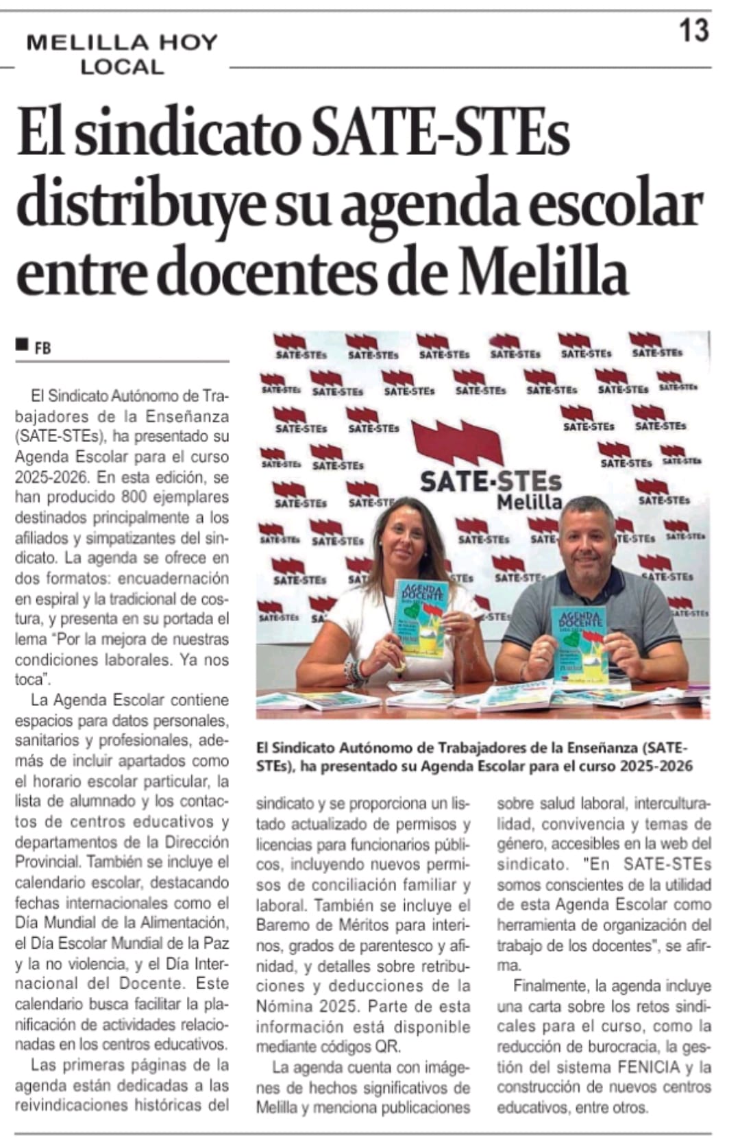 SATE-STEs PRESENTA SU AGENDA DOCENTE PARA EL CURSO ESCOLAR 2025-2026 por SATE STEs | Oct 14, 2025 | Acción Sindical, Comunicados, Noticias COMUNICADO OFICIAL COMUNICADO EN: EL FARO DE MELILLA COMUNICADO EN: ONDA CERO MELILLA COMUNICADO EN: RTVE MELILLA COMUNICADO EN: POPULAR TV COMUNICADO (2º PARTE) EN: POPULAR TV COMUNICADO EN: CADENA COPE COMUNICADO EN: MELILLA HOY