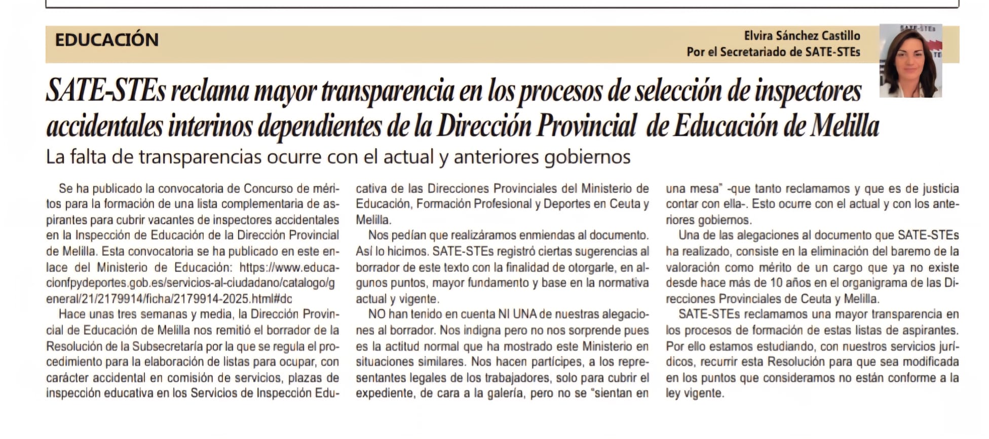 SATE STEs RECLAMA MAYOR TRANSPARENCIA EN LOS PROCESOS DE SELECCIÓN DE INSPECTORES ACCIDENTALES EN MELILLA por SATE STEs | Jul 11, 2025 | Acción Sindical, Comunicados, Noticias COMUNICADO OFICIAL COMUNICADO EN: MELILLA HOY COMUNICADO EN: ONDA CERO MELILLA COMUNICADO EN: CADENA COPE