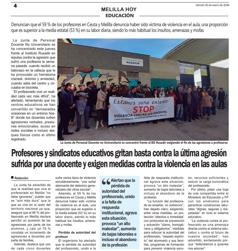 La Junta de Personal Docente No Universitaria de Melilla ha reunido en el IES Rusadir a representantes sindicales y docentes de la ciudad tras la agresión sufrida recientemente por una profesora del centro.