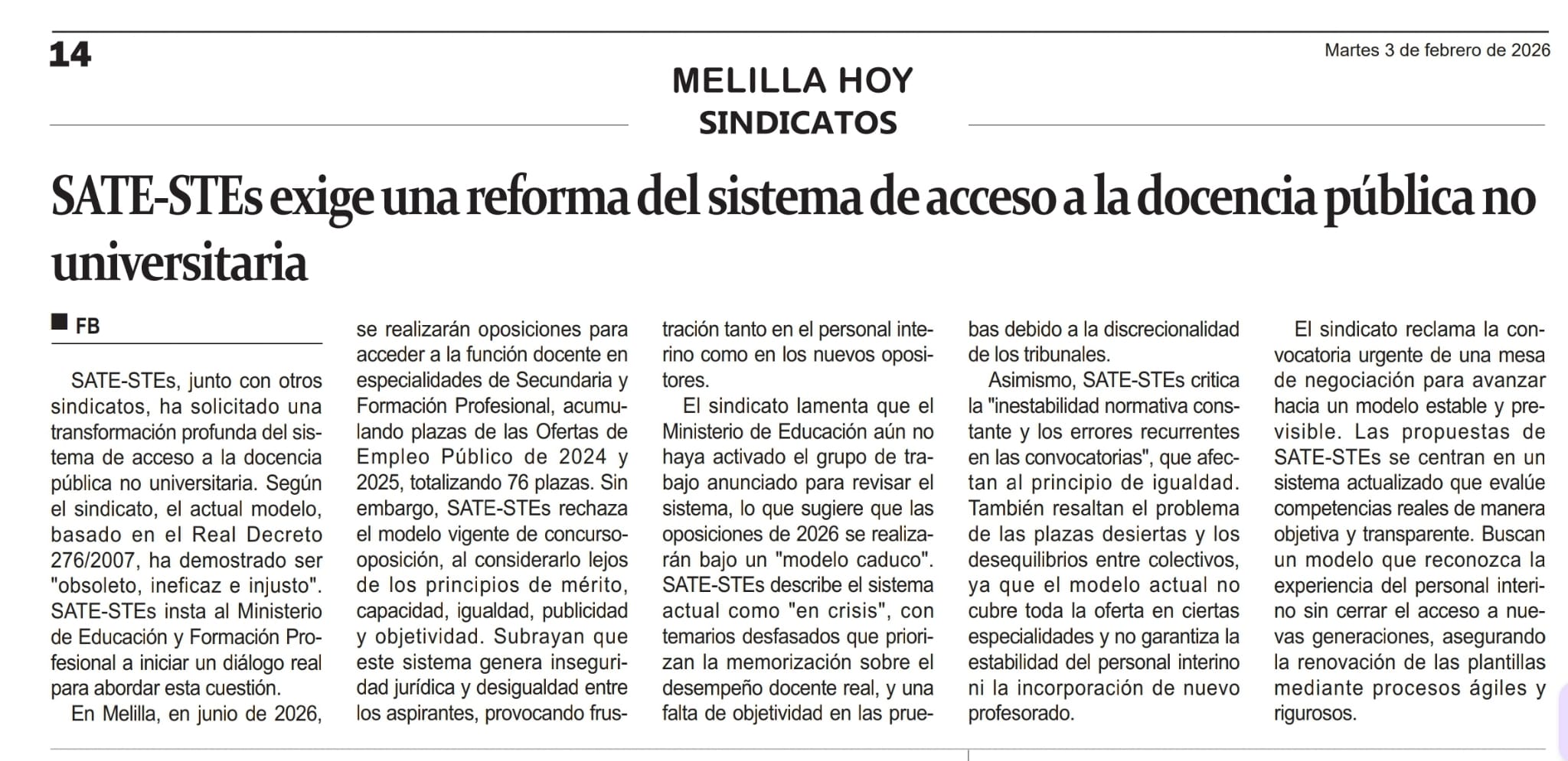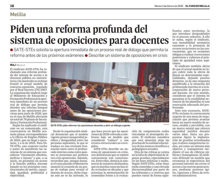 SATE-STEs RECLAMAMOS UNA REFORMA PROFUNDA DEL SISTEMA DE ACCESO A LA PROFESIÓN DOCENTE por SATE STEs | Feb 3, 2026 | Acción Sindical, Comunicados, Noticias, Oposiciones COMUNICADO OFICIAL COMUNICADO EN: EL FARO DE MELILLA COMUNICADO EN: MELILLA HOY COMUNICADO EN: TV MELILLA