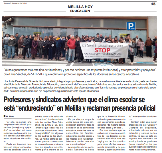 💥💥La concentración fue organizada por la Junta de Personal Docente No Universitario de Melilla. A ella asistieron varios miembros del secretariado de SATE-STEs